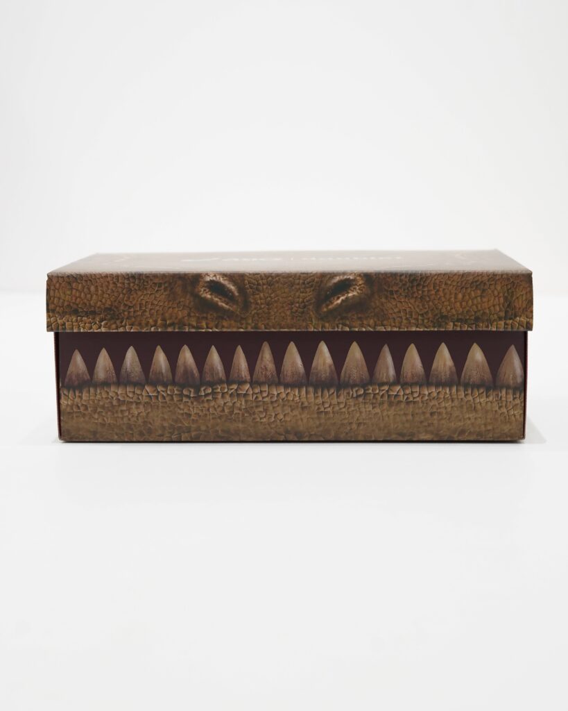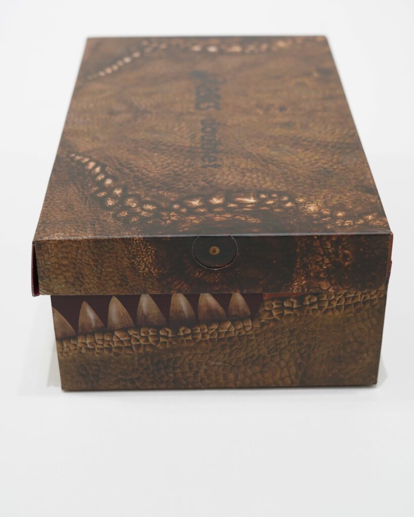 シューレースを外すことで、シューズは更に恐竜に似た形状へと変法を遂げます。(もちろん、スリッポンとして履くことも可能です。)