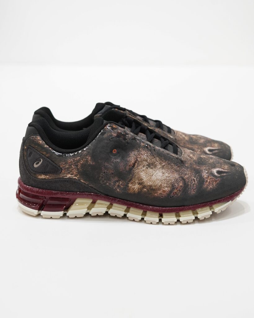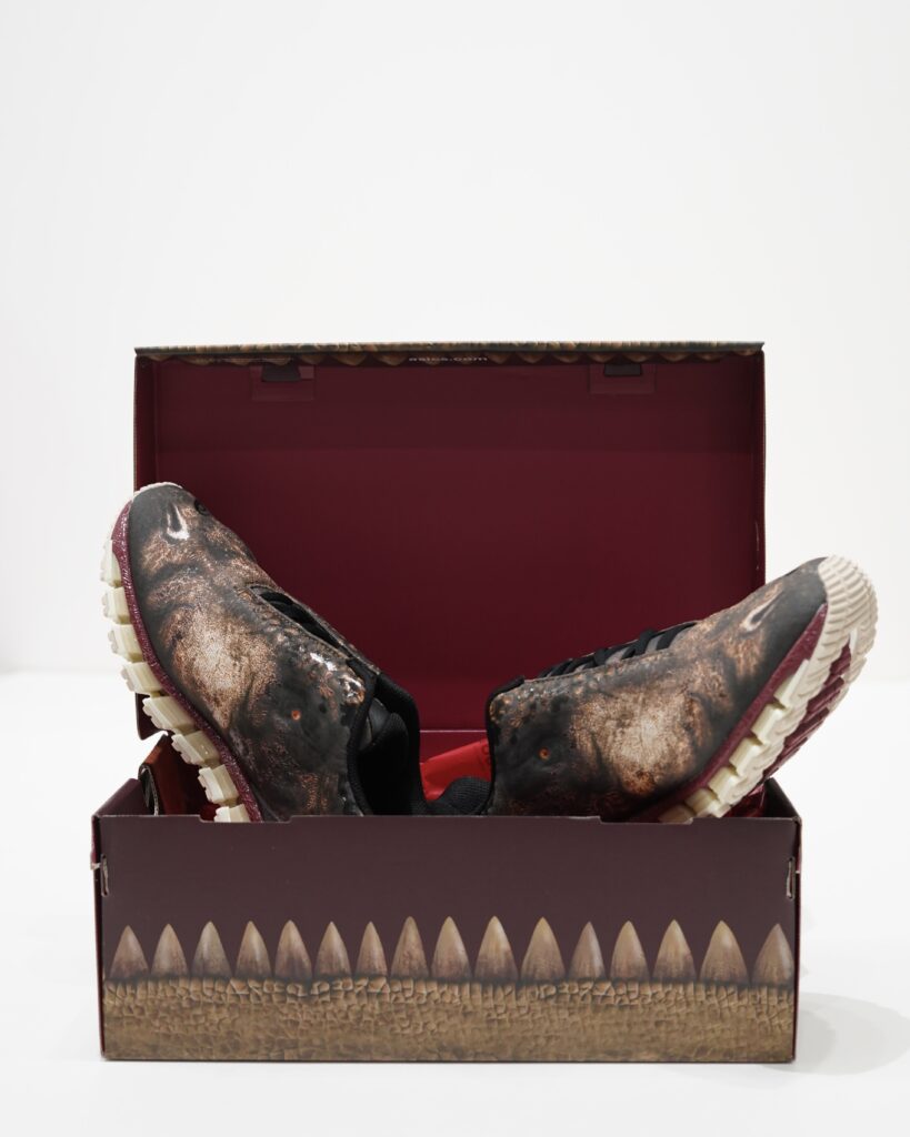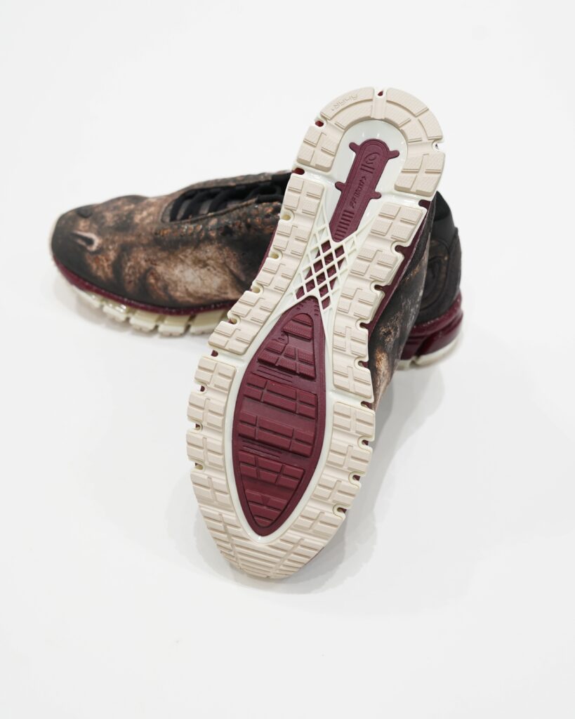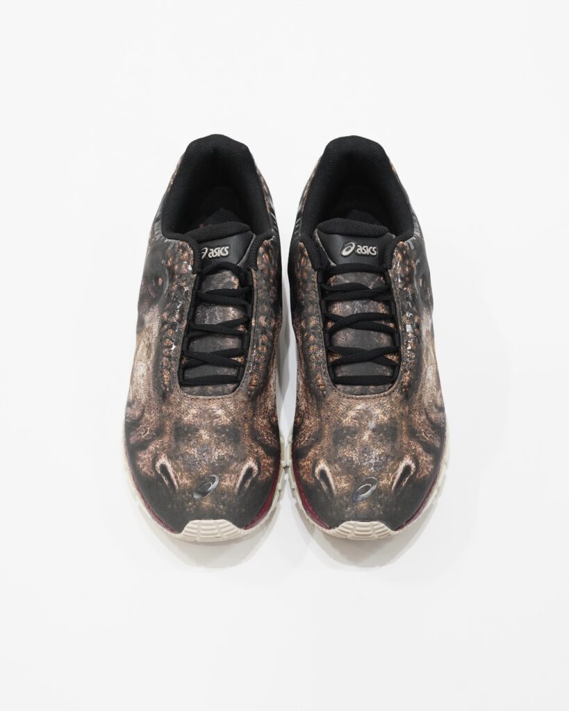 生物的な感覚を強調するため、靴のアイレットとつま先部分に凹凸のある詳細が施され、靴全体に光沢のあるクリアプリントが施され、生き物の生々しさを表現しています。
