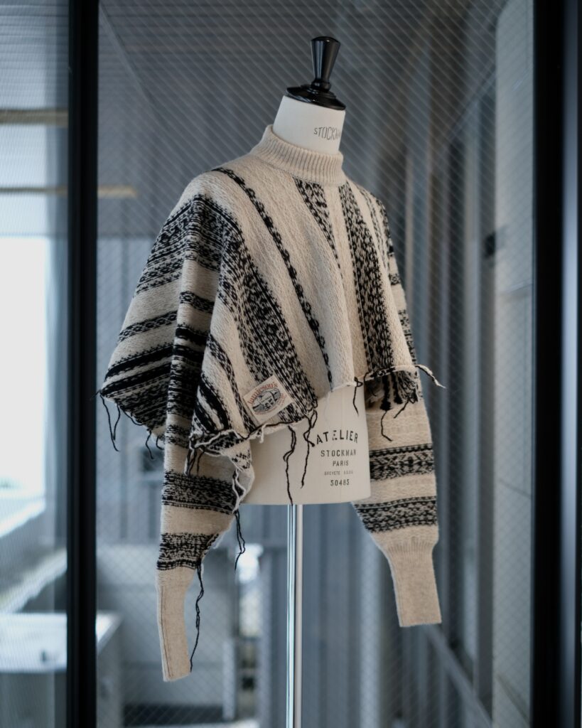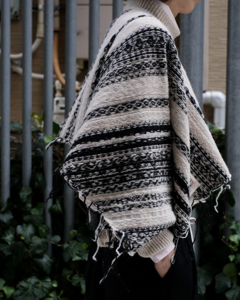 フェアアイル柄の表も裏も柄や色が素敵で好きなのですが、トラディショナルさを残しつつ新しく感じるバランスを求め色々考えていたら、セーターとマフラーの中間のようなデザインが生まれました。