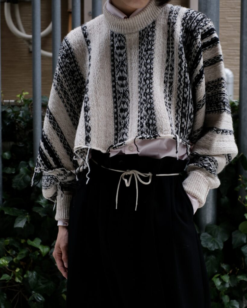 普通に着るとクロップドセーターですが、右袖下が閉じていないので右袖を首に巻くと