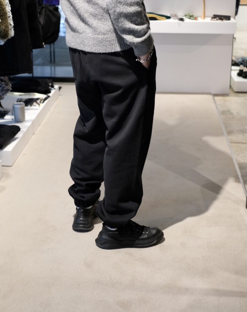 ニットとスウェットパンツのスタイリング、