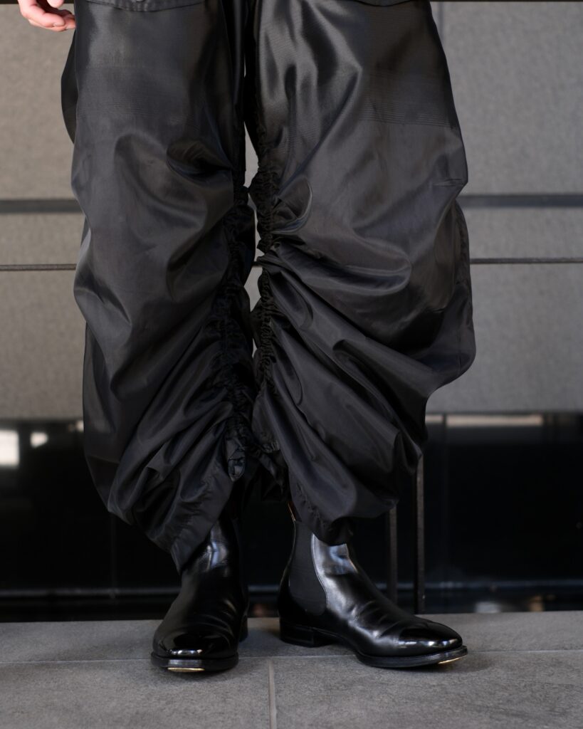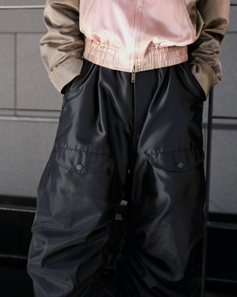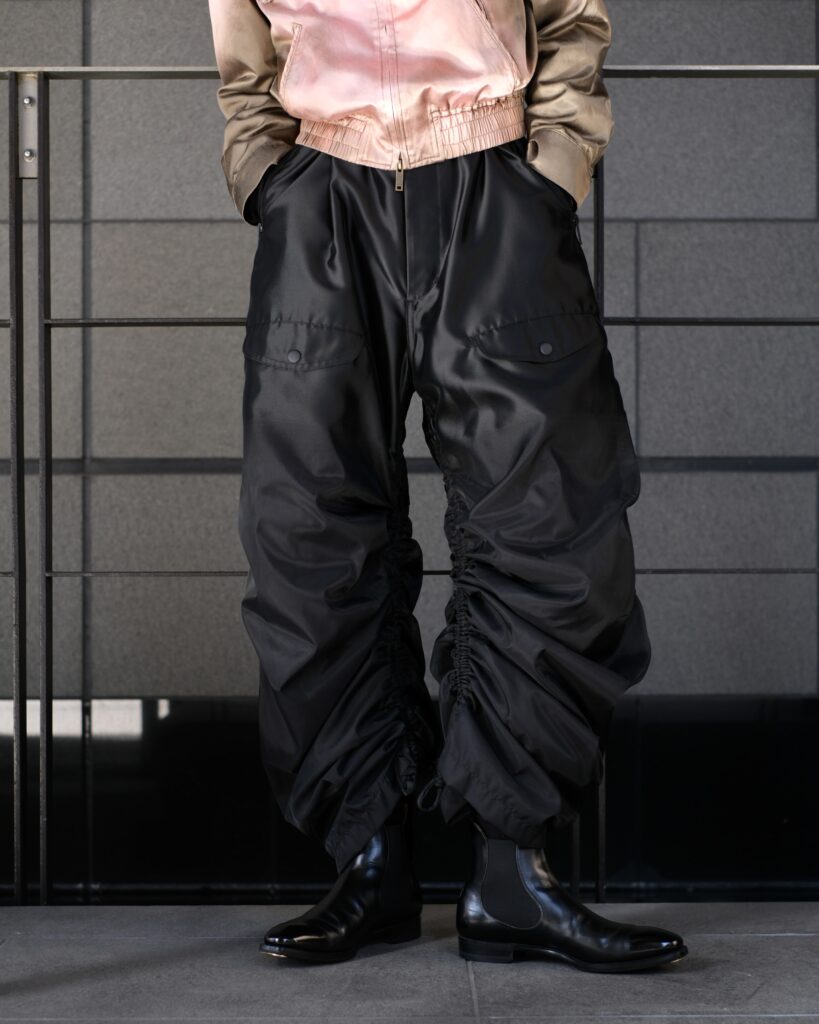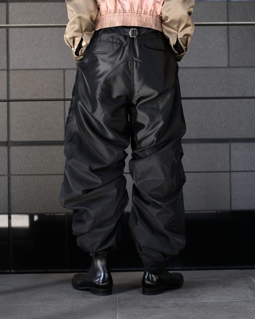 TAAKKならではの特徴のあるMA-1素材で仕立てたパラシュートパンツ。