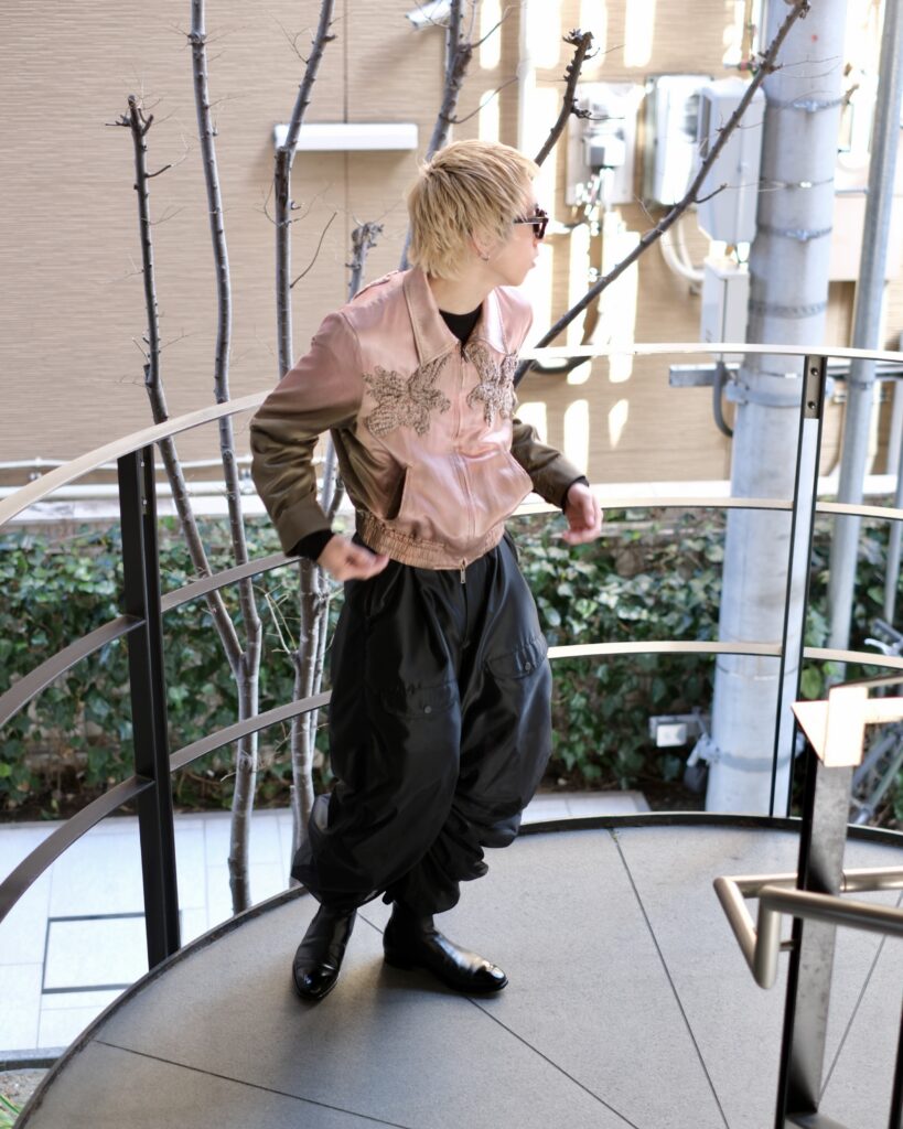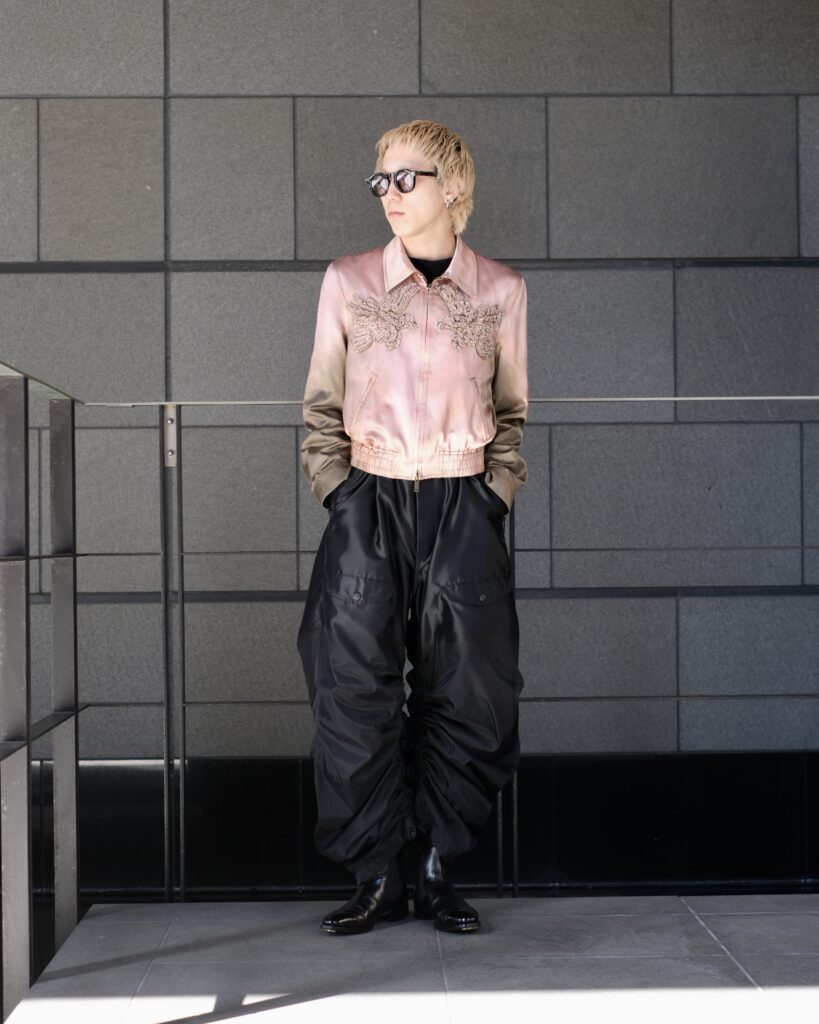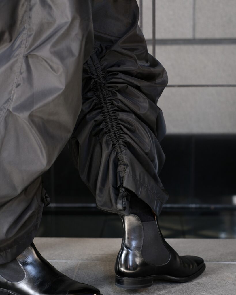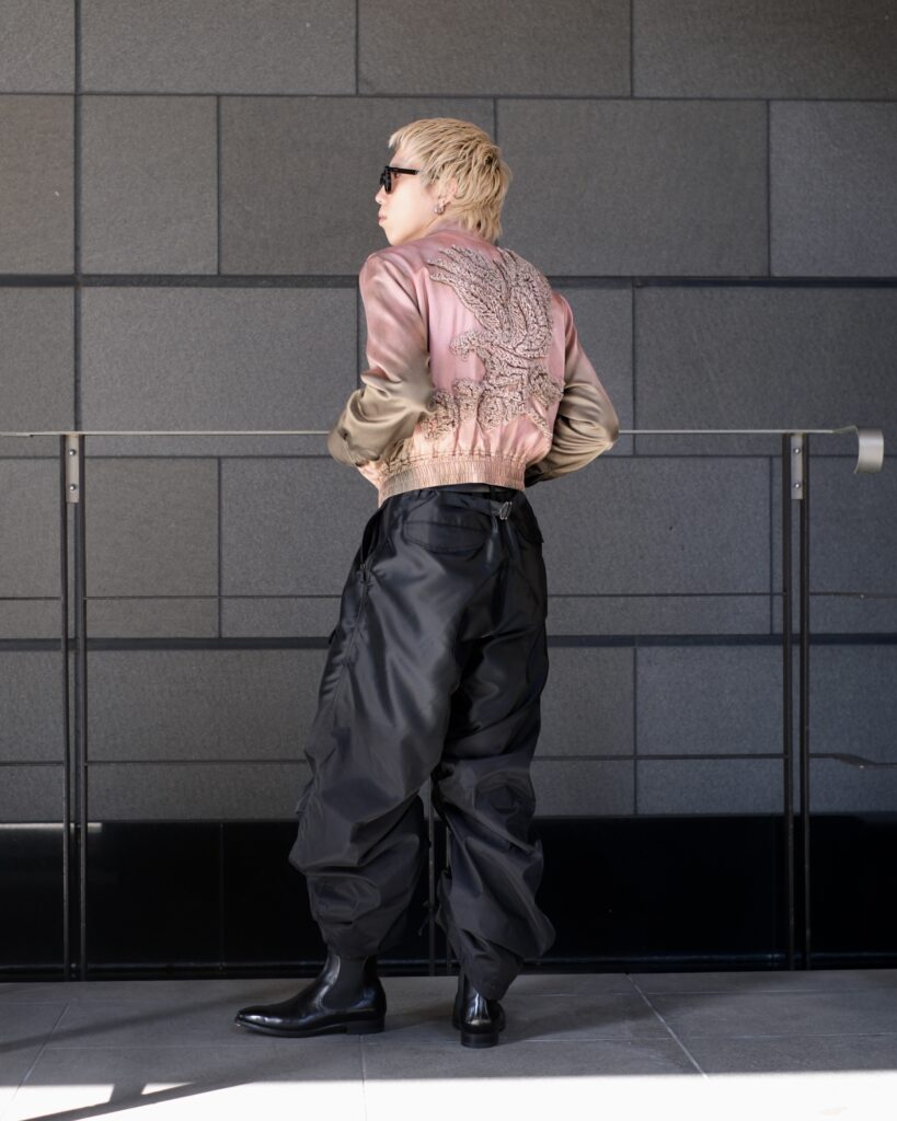 TAAKKならではの特徴のあるMA-1素材で仕立てたパラシュートパンツ。