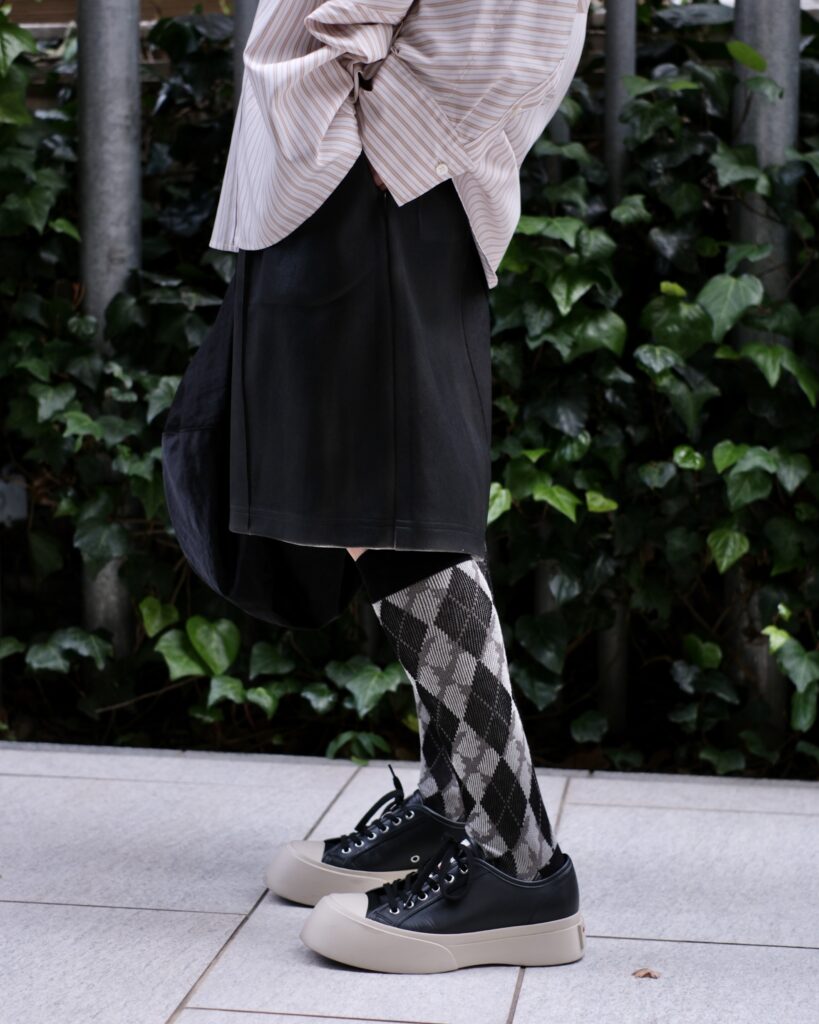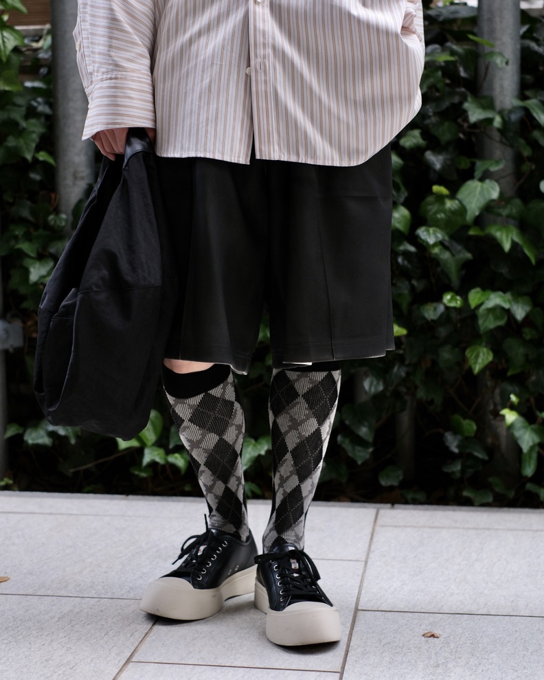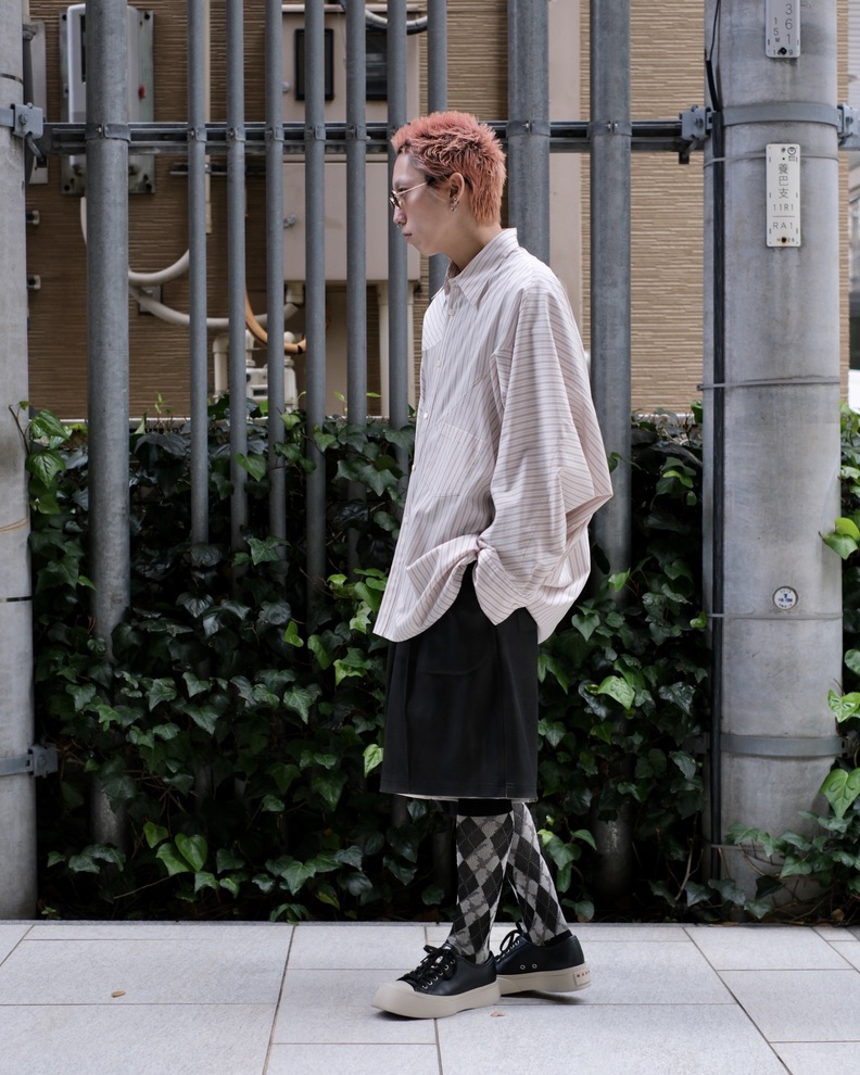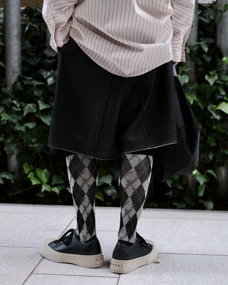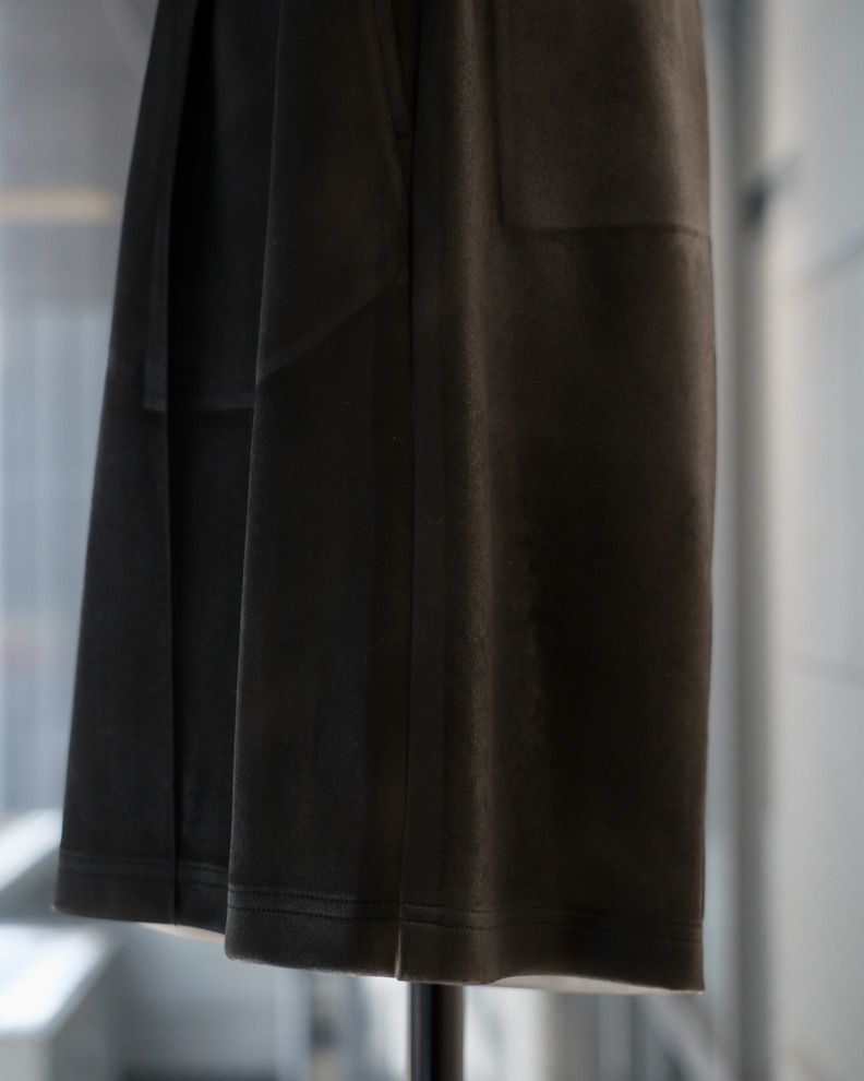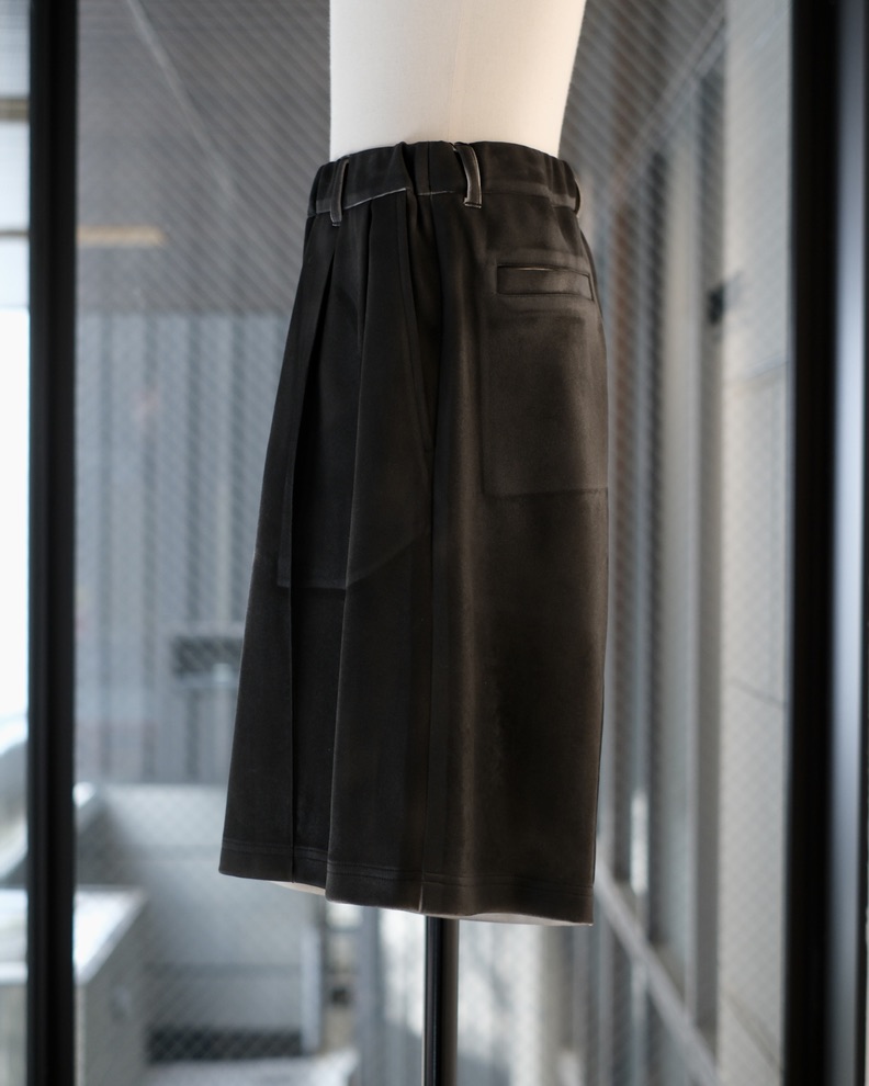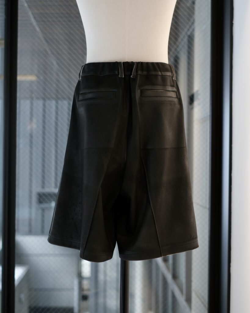 職人の手によって一枚一枚スプレー加工が施され、レザーを思わせる光沢と奥行きを表現したショーツ。程よいワイドシルエットと構築的なタックが動きと立体感を生み出し、カジュアルなアイテムにクラフトの重みを与えています。