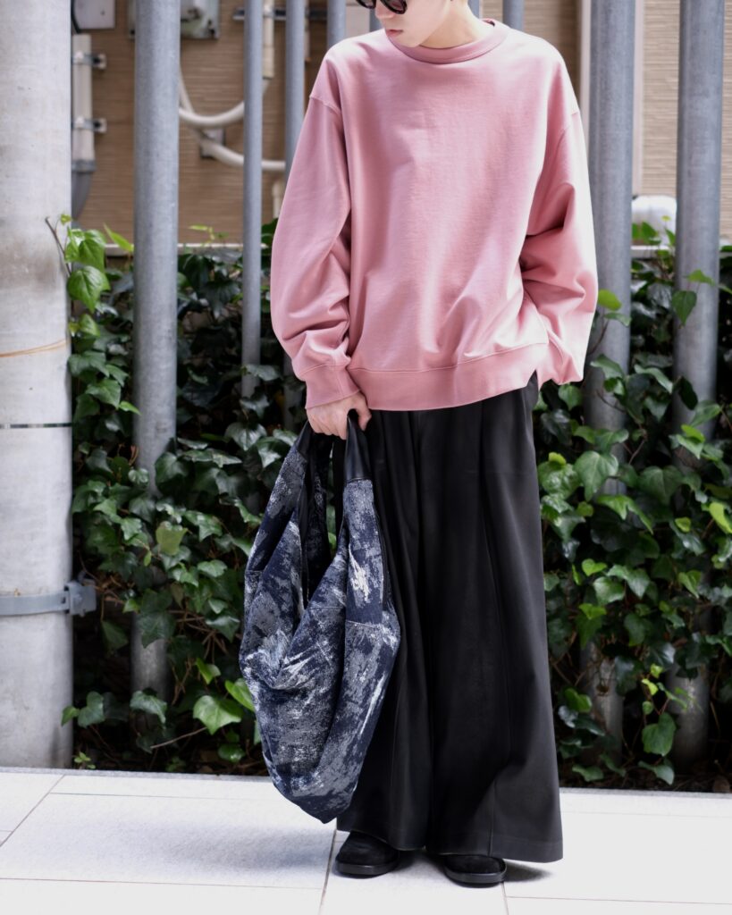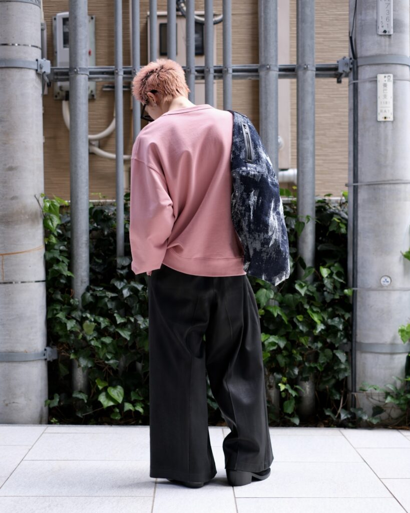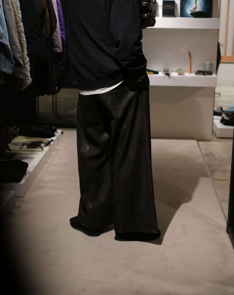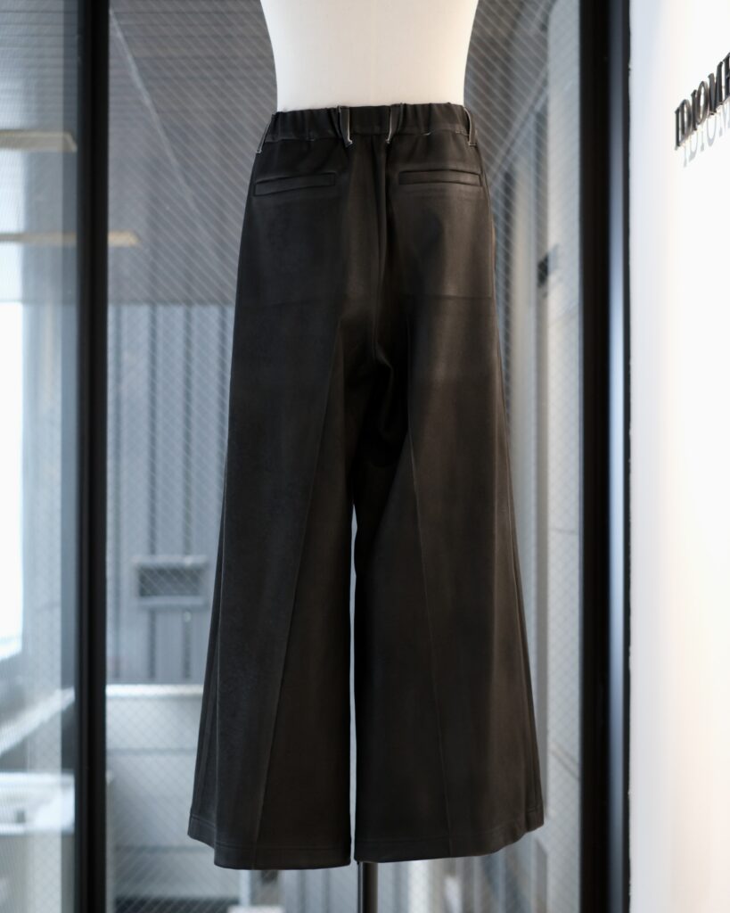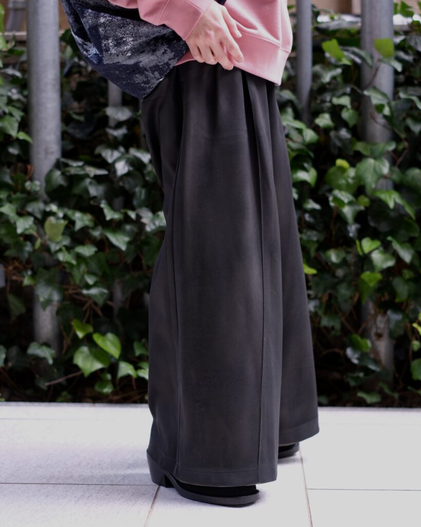 レザーのような艶感と奥行きを纏わせたワイドパンツ。